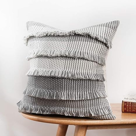 Amazon Com Blue Page Boho Decorative Throw Pillow Covers For Sofa Couch Bedroom Gradient Grey Fringes Square Cushion Cover 18 X 18 Inch Modern Accent Home Decor Soft Pillowcase Handmade Neutral Home